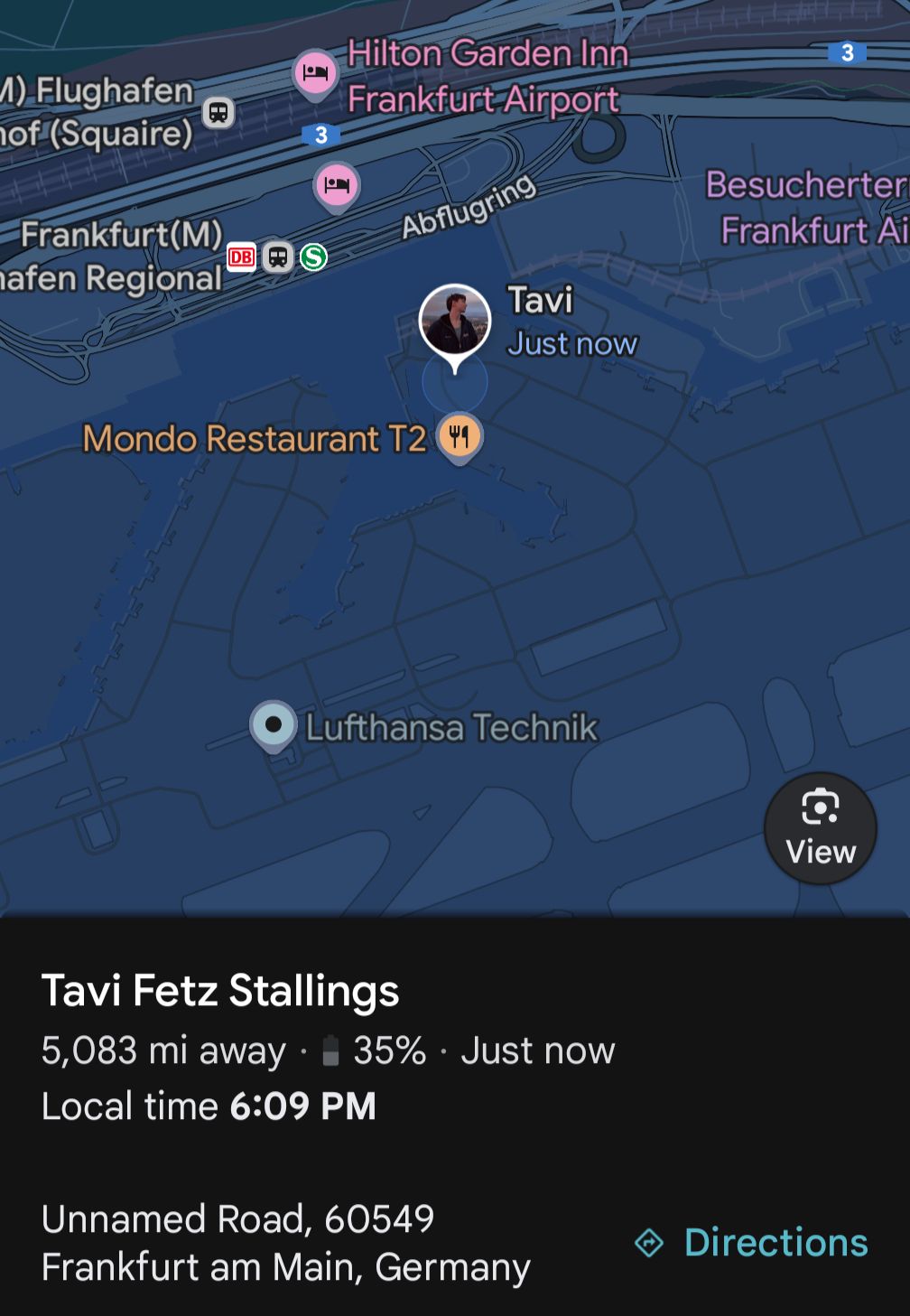 At 4am, I woke up and checked Google Maps. Tavi allows me to have him as my one stalked contact, and his location quickly pinged: Frankfurt Airport,. 35% battery. Five thousand miles away.